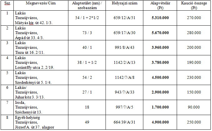 A Tiszaújváros Polgármesteri Hivatala értékesítésre meghirdeti az önkormányzat tulajdonában lévő alábbi üres társasházi lakás- és helyiség ingatlanokat: