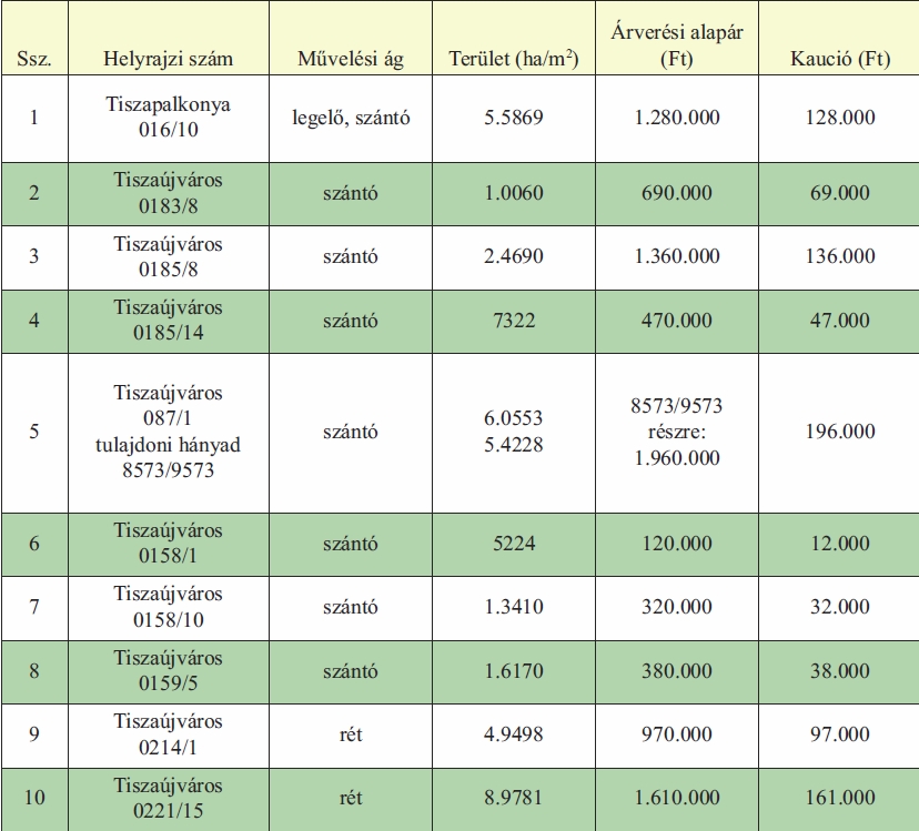 Tiszaújváros Polgármesteri Hivatala értékesítésre meghirdeti az önkormányzat tulajdonában lévő alábbi külterületi termőföld ingatlanokat.